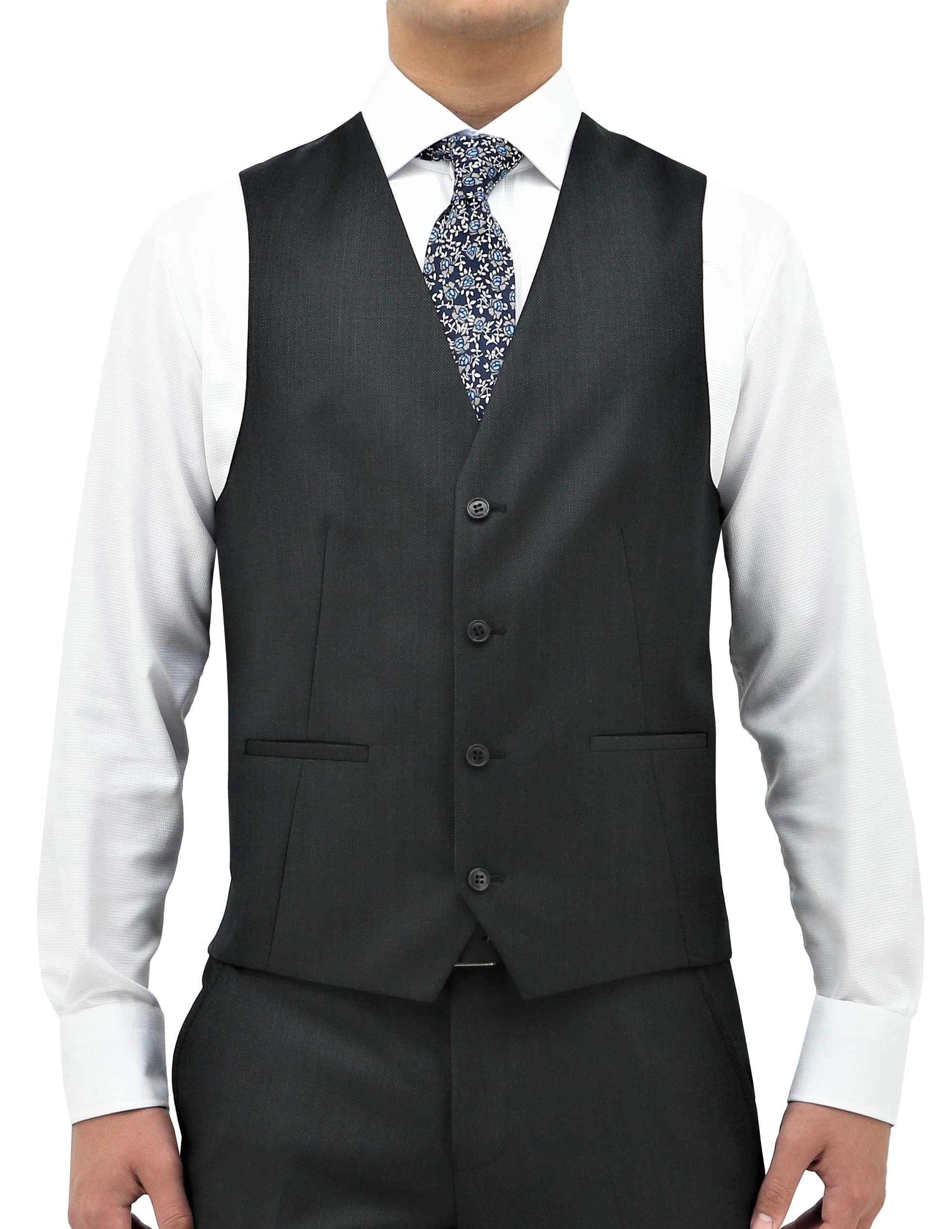 The Luke 101 Black Wool Waistcoat is a single-breasted vest with a black palette and a micro dot texture, v-neckline and jetted pockets.
